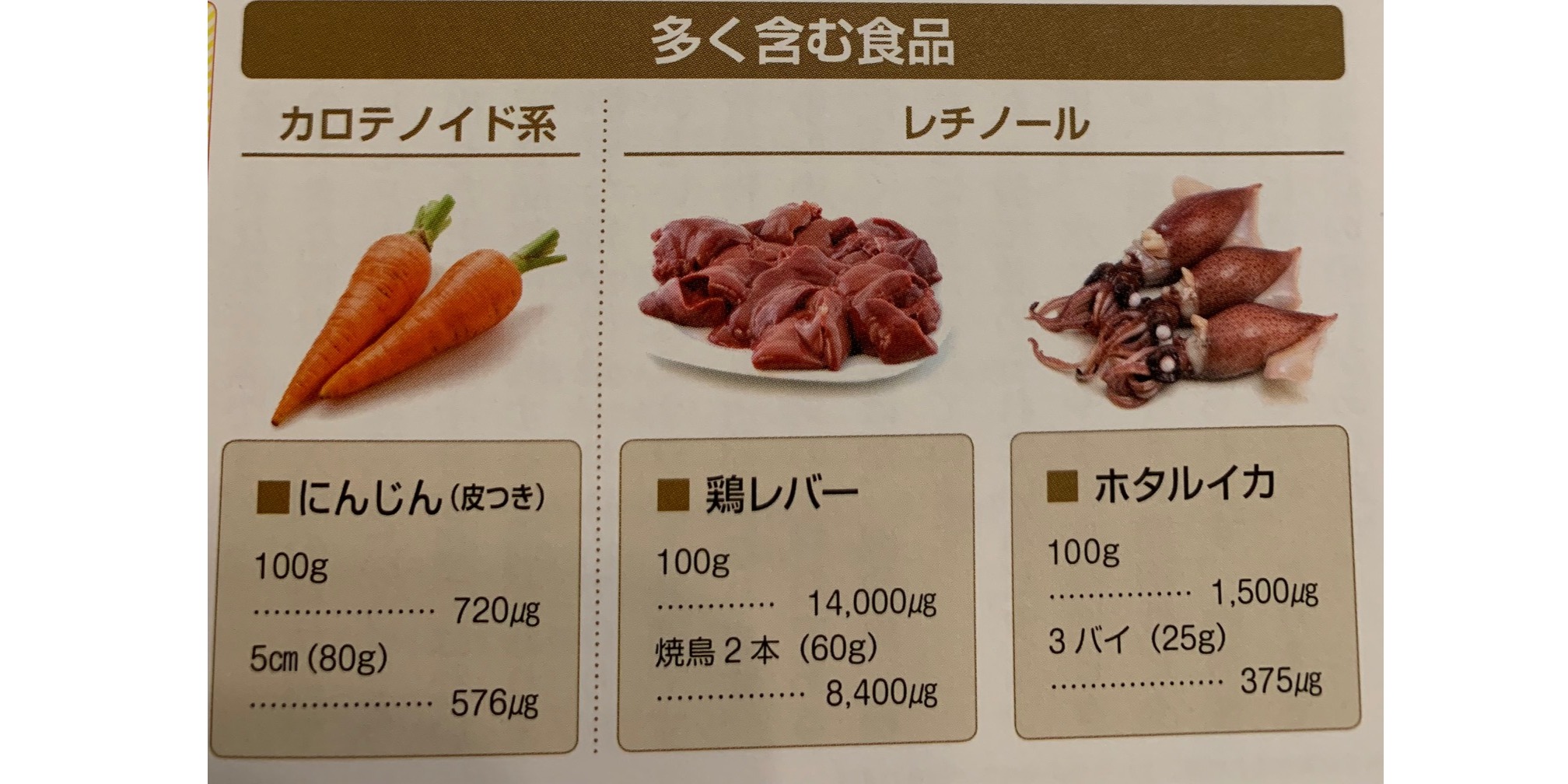 ビタミンAはにんじん、海苔、ワカメ、抹茶など。