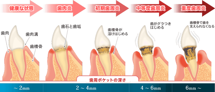 歯周病とは細菌の感染によって引き起こされる病気です。虫歯とは違い、直接歯には影響せず、歯を支えている周りの組織(歯周組織)を破壊してしまいます。