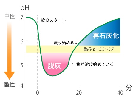 飲食前のお口の中はpH7の中性ですが、飲食を開始するとすぐに酸性に傾き、食事中はpHが元に戻ることはなく、歯が溶ける状態が続いてしまいます。