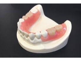 入れ歯のクラスプという、歯にひっかけるバネの部分がピンクの樹脂で出来ていて、歯肉との見分けがつきにくく見た目がとても自然な義歯です。