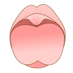 舌小帯とは、舌の裏側から下の歯ぐきに伸びているスジことです。このスジが生まれつき短かったり、スジが舌の先端についていることがあり、このような状態を舌小帯短縮症と言います。舌を前に突き出すと下の図のように舌の先端にくびれが出来。ハート型になります。