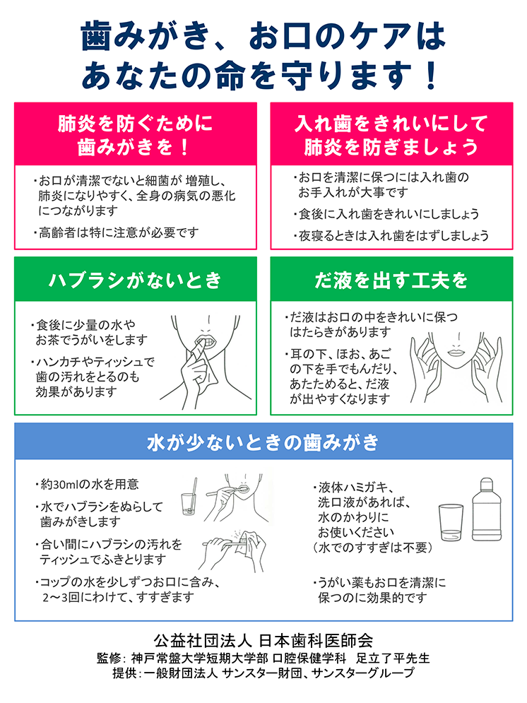 災害発生時は、ストレスや食生活の偏りなどで免疫力が低下することで口腔内の細菌