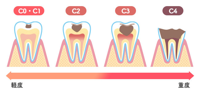 C0、C1は初期段階の虫歯であり、痛みなどの自覚症状がない場合が多いのですが、C2になると、象牙質まで虫歯の侵食が進んでいる状態ですので、痛みを感じる可能性が高いです。