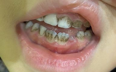 ブラックステインとは、各国の小児の約2~20%にみられると報告されている色素沈着の一種です。ブラックステインは歯茎に沿った歯の表面に、薄い線または、黒くて細かい粒子状の色素がとびとびの点として認められます。