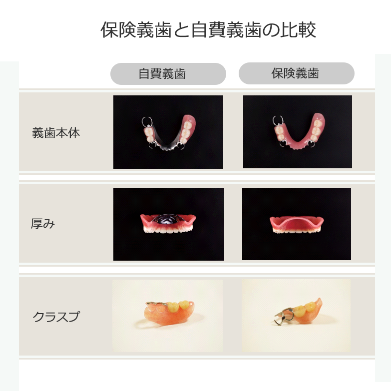 保険の義歯は、国が定めたルールに基づいて製作され、基本的には最低限の機能回復を目的としています。一方で、自費の義歯は患者さま一人ひとりの要望やお口の状態に合わせて、より高品質な材料や技術を使って製作されるため、見た目や使い心地に優れています。